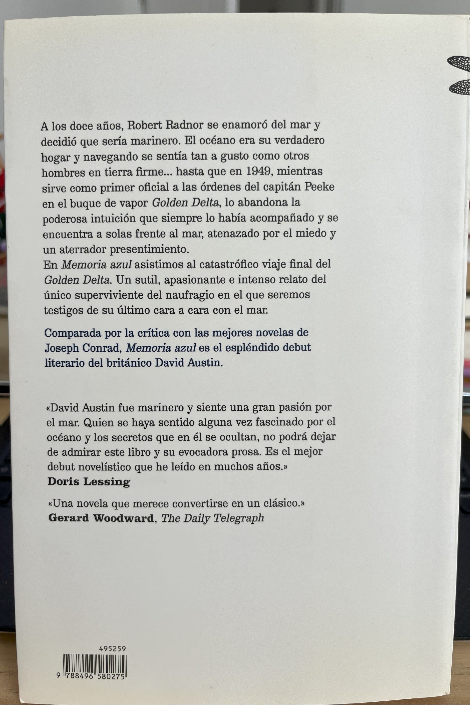 En Memoria azul asistimos al catastrófico viaje final del Golden Delta. Un sutil, apsasionane e intenso relato del único supreviviente del naufragio en el que sermes testigos de su útlimo cara a cara con el mar. Comprada por la crítica con las mejores novelas de Joseph Conrad, Memoria azul es el espléndido debut litarario del británico David Austin.