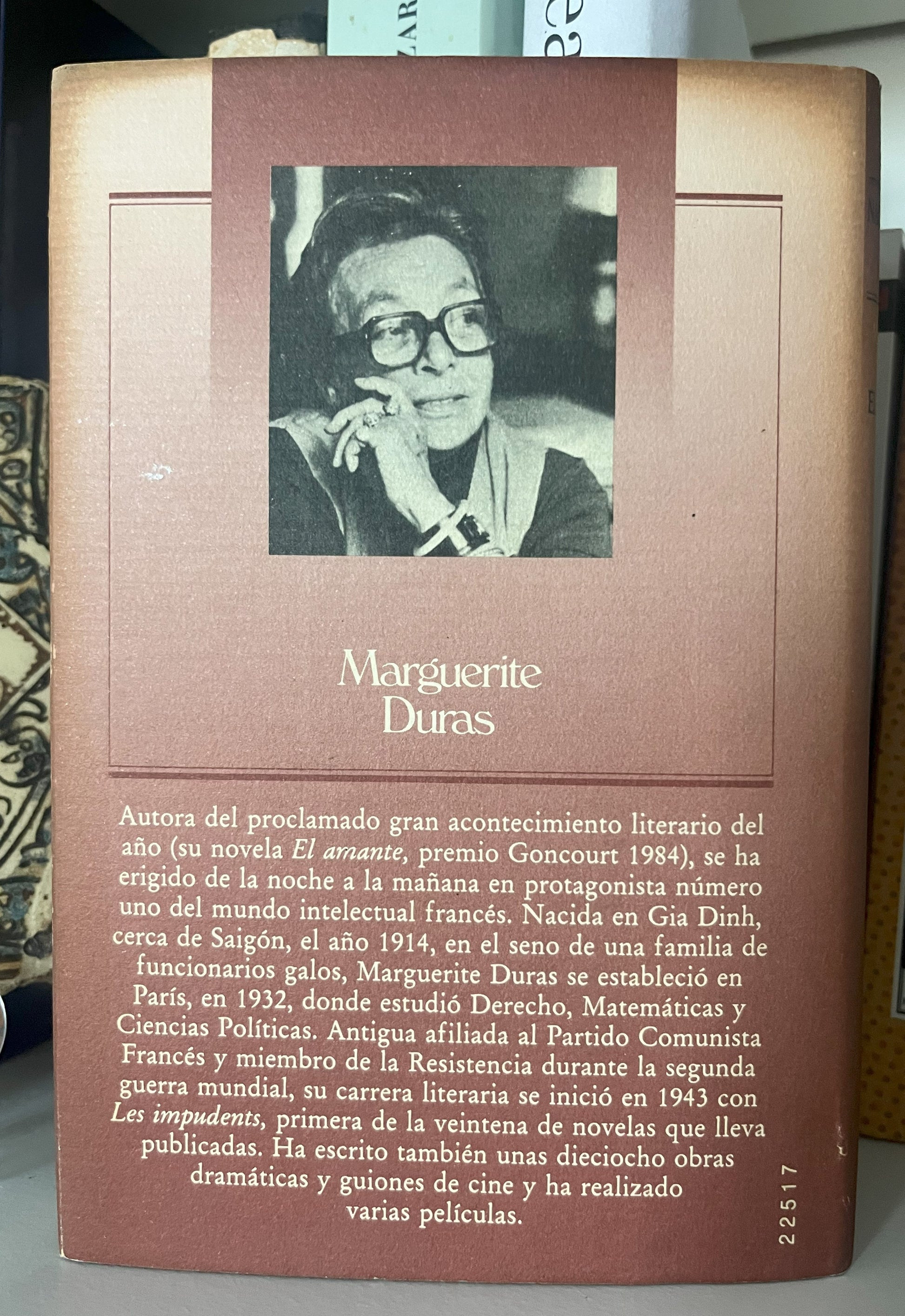 Cuarenta y un años después de publicar su primera novela, Marguerite Duras se convierte de la noche a la mañana, con El amante, en una autora solicitada por todos los públicos. Y, además, recibe poco después, en noviembre de 1984, el prestigioso Premio Goncourt. A todos emociona sin duda esta narración autobiográfica en la que la autora expresa, con la intensidad del deseo, esa historia de amor entre una adolescente de quince años y un rico comerciante chino de veintiséis. Esa jovencita bellísima, pero pobre, que vive en Indochina, no es otra que la propia escritora quien, hoy, recuerda las relaciones apasionadas, de intensos amor y odio, que desgarraron a su familia y, de pronto, grabaron prematuramente en su rostro los implacables surcos de la madurez. Pocas personas -y en particular mujeres- permaneceran inmunes a la contagiosa pasión que emana de este libro.